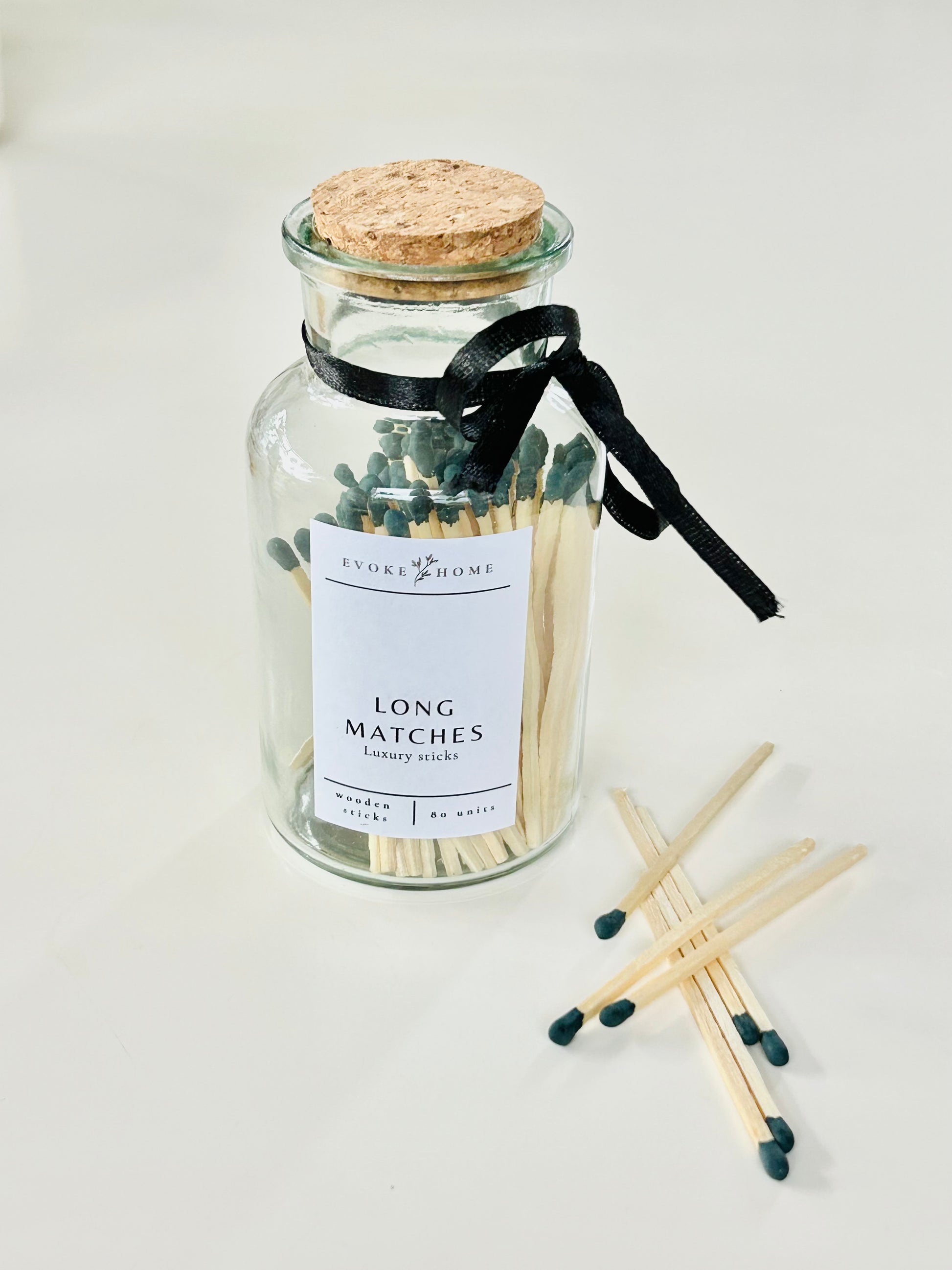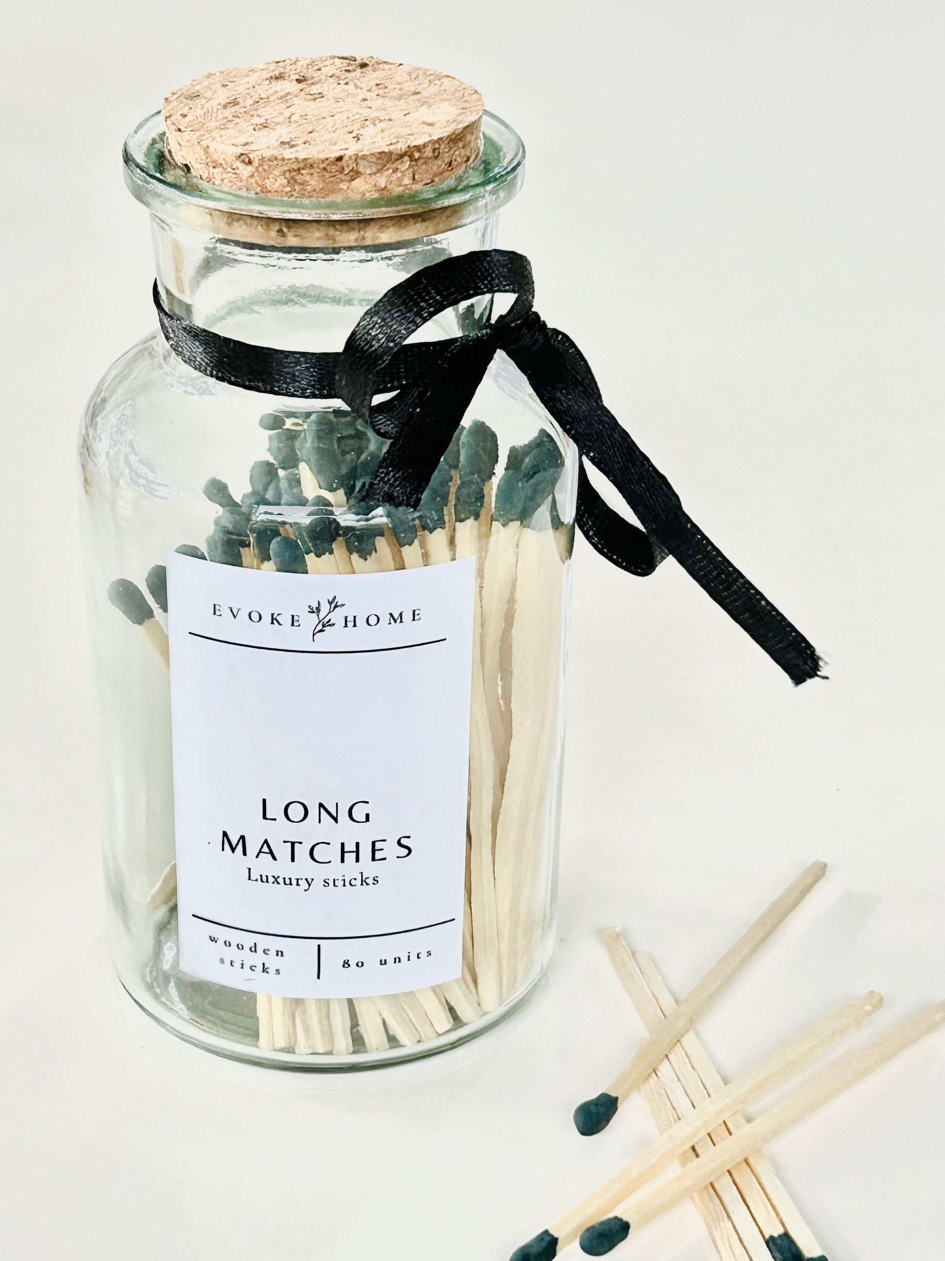 Presentadas en un frasco de vidrio reutilizable con tapa de corcho y lazo decorativo de tela negra, estas cerillas no solo son prácticas, sino también un bonito elemento decorativo. Su diseño minimalista y atemporal las convierte en el complemento perfecto para cualquier espacio.